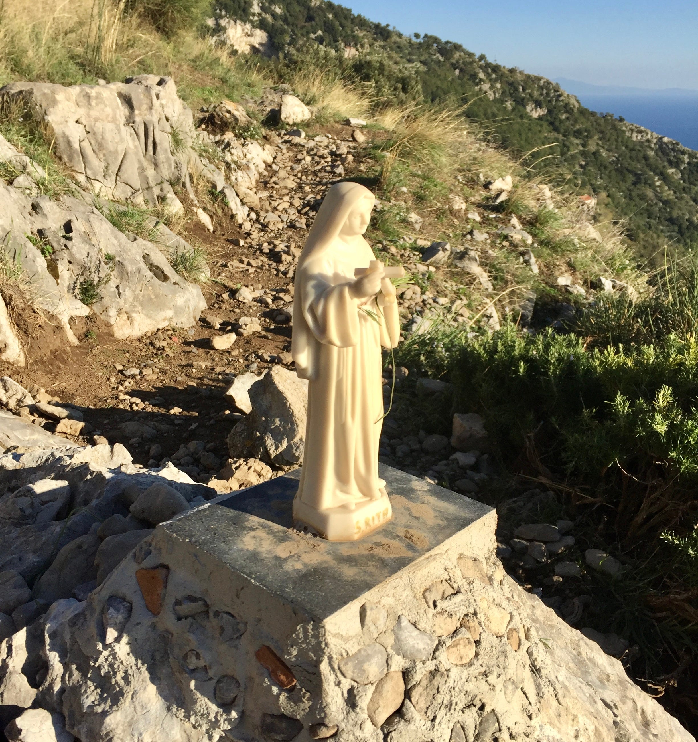 Along the trail, we passed small devotional sculptures set into the landscape—figures carved and placed on stone pedestals, watching over the path. One was a statue of the Virgin Mary, the pale stone contrasting against the rock, her presence quiet yet powerful. Standing there in the mountains, high above the sea, it felt like an offering of protection. A blessing for those moving through uncertain ground.